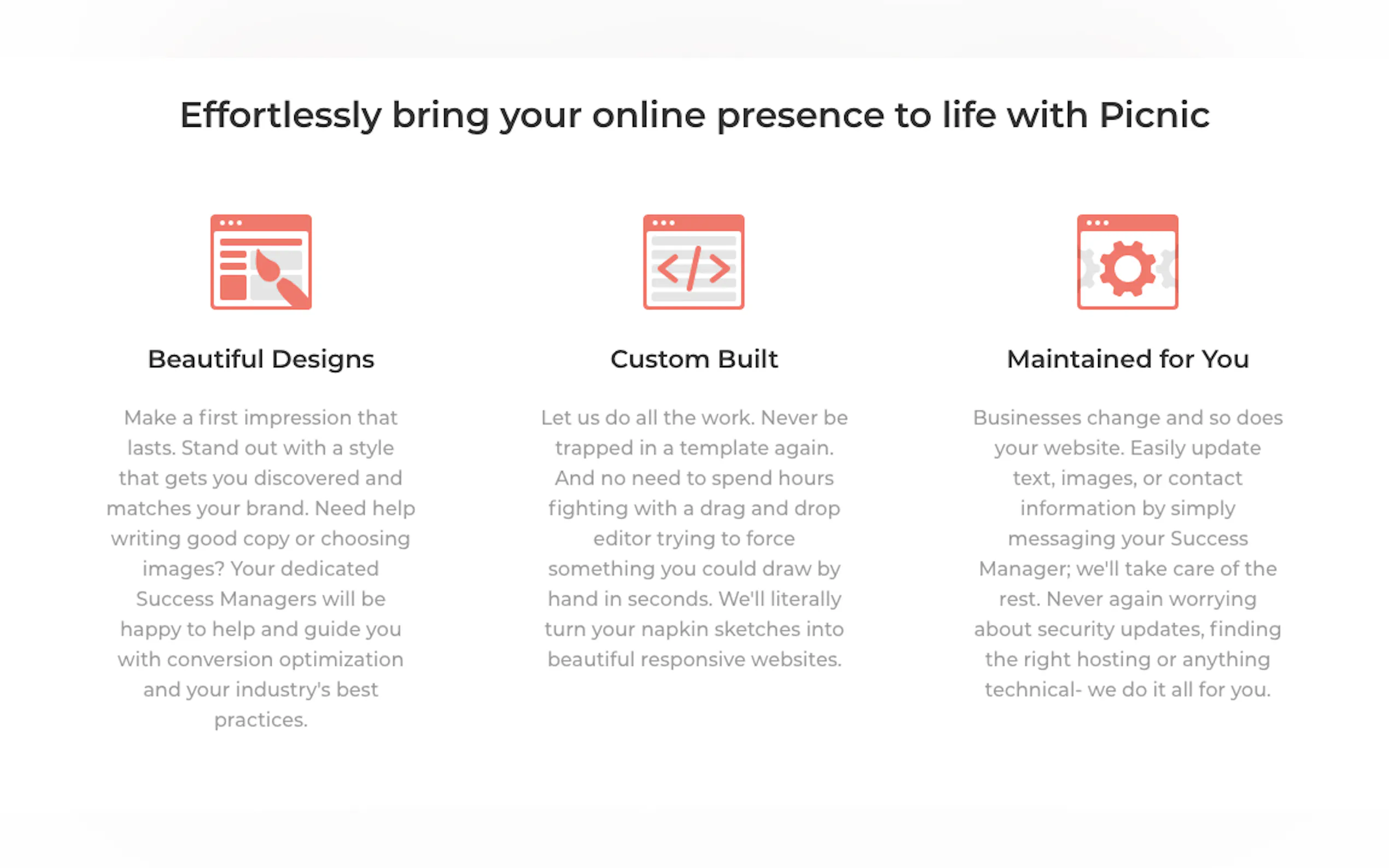 With Picnic, you'll no longer have to worry about the intricacies of website building. Instead, let this innovative platform handle hosting, maintenance, and updates for you over time, ensuring your site remains current and optimized for various devices.